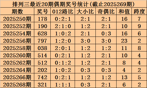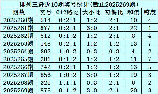 上期回顾:排列三2025269期奖号为875,奇偶比为2:1,大小比为3:0,跨度为20。