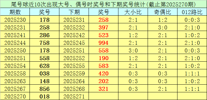 在尾号球前10次开出大号、偶号类型之后,其下期分别开出奖号:258、397、523、994、558、190、583、420、202、321,其中号码012路比为4:3:3,奇偶比为4:6,大小比为3:7。