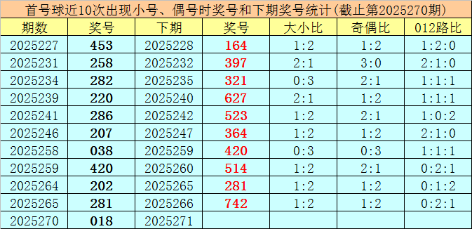 在首号球前10次开出小 号、偶号类型之后,其下期分别开出奖号:164、397、321、627、523、364、420、514、281、742,其中号码奇偶比为7:3,大小比为4:6,012路比为4:3:3。