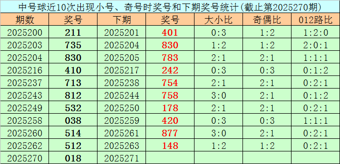 在中号球前10次开出小 号、奇号类型之后,其下期分别开出奖号:401、830、783、242、754、758、178、420、877、148,其中号码大小比为5:5,012路比为2:4:4,奇偶比为5:5。