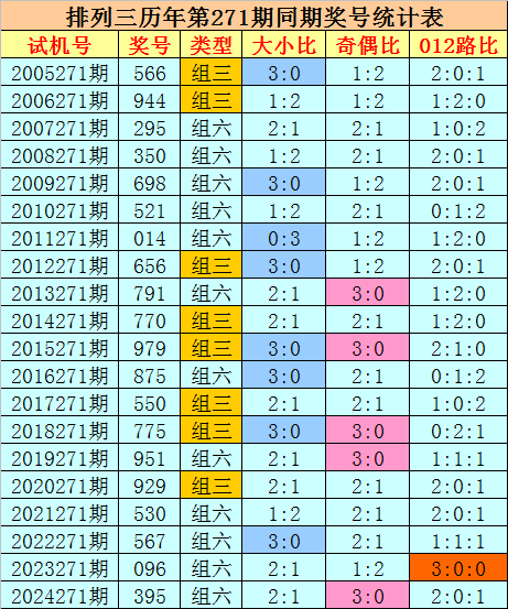 奇偶分析:历史上排列三第271期同期奖号中,奇偶比0:3没有出现,奇偶比3:0出现5期,奇偶比1:2出现6期,奇偶比2:1出现9期,奇偶奖号总比例开出39:21,偶数号码走势较冷,今年第271期适当看好偶数号码回补,防开出全偶组合。