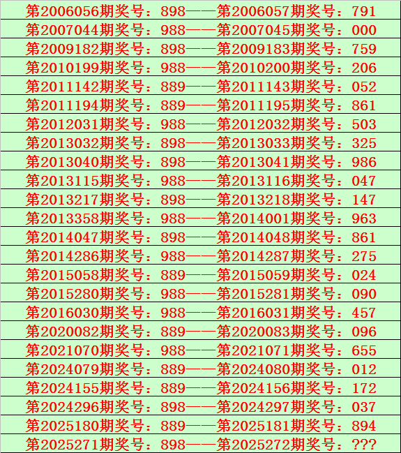 开奖回顾:体彩排列三第2025271期奖号为:898,类型:组三。