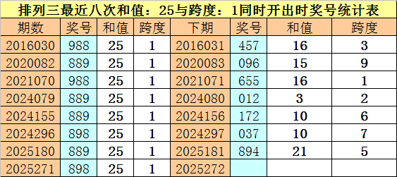 开奖回顾:体彩排列三第2025271期奖号为:898。和值为:25,跨度为:1。