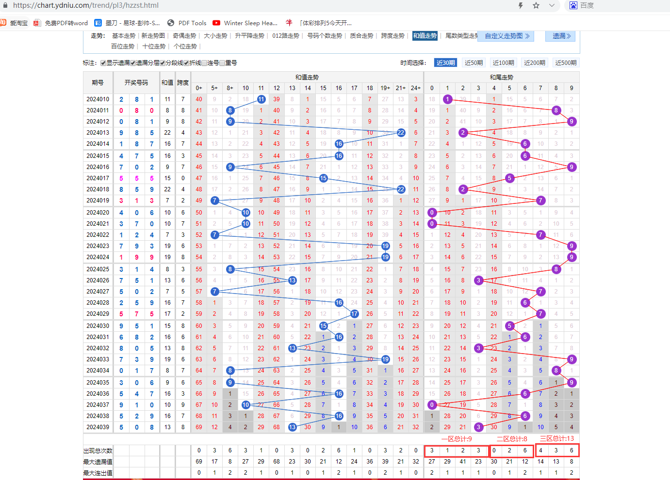 以排列三近30期尾数走势图中看出,一区有四个位置,但是30期的出现次数仅为9次,我们说近期一区并不活跃,而三区近30期总计是出现13次,是最为活跃的。