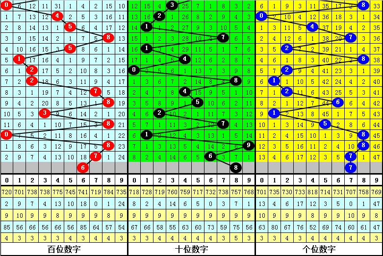 百位分析:该位上期奖号为7,出现1路、奇数、大号,在前11期奖号,该位012路比为2:3:6,0路号码最冷,目前012路号码遗漏期数分别为2、0和1,近期百位注意0路号码走热。