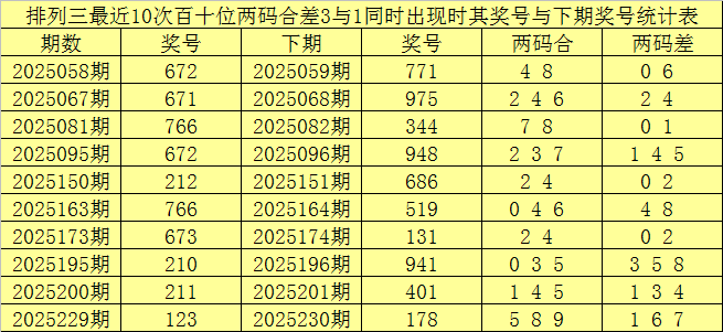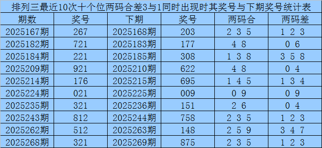 十个位合差分析:上期奖号十个位开出67组合,两码合为3,两码差为1,最近10次十个位两码合3与两码差1同时出现时,其奖号和下期奖号分别为: