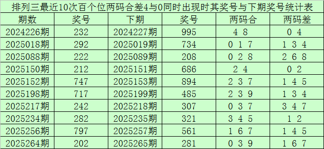 百个位合差分析:上期奖号百个位开出77组合,两码合为4,两码差为0,最近10次百个位两码合4与两码差0同时出现时,其奖号和下期奖号分别为: