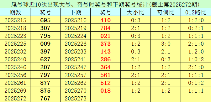 在尾号球前10次开出大号、奇号类型之后,其下期分别开出奖号:410、784、021、373、143、286、364、561、512、018,其中号码奇偶比为4:6,大小比为2:8,012路比为4:4:2。