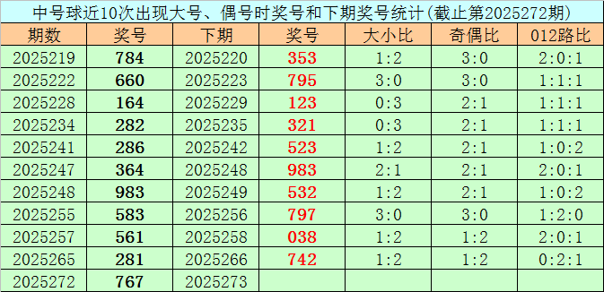 在中号球前10次开出大号、偶号类型之后,其下期分别开出奖号:353、795、123、321、523、983、532、797、038、742,其中号码奇偶比为5:5,大小比为4:6,012路比为4:1:5。