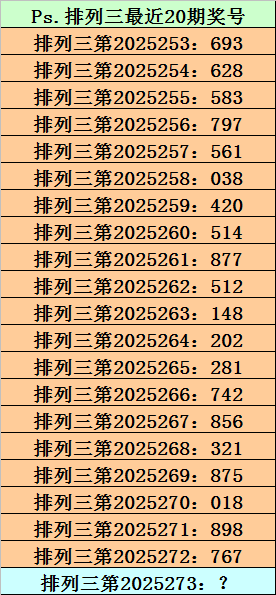 第2025272期排列三奖号为767,历史上该号码组选开出20次,下期奖号分别为:024、893、457、674、628、813、728、844、478、797、929、237、845、007、473、074、203、893、346。