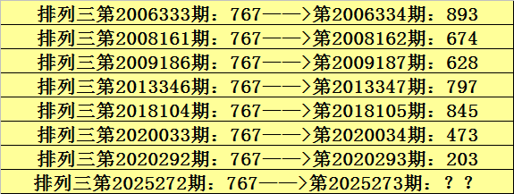 第2025272期排列三奖号为767,历史上该号码直选出现8次,下期奖号分别为:893、674、628、797、845、473、203。