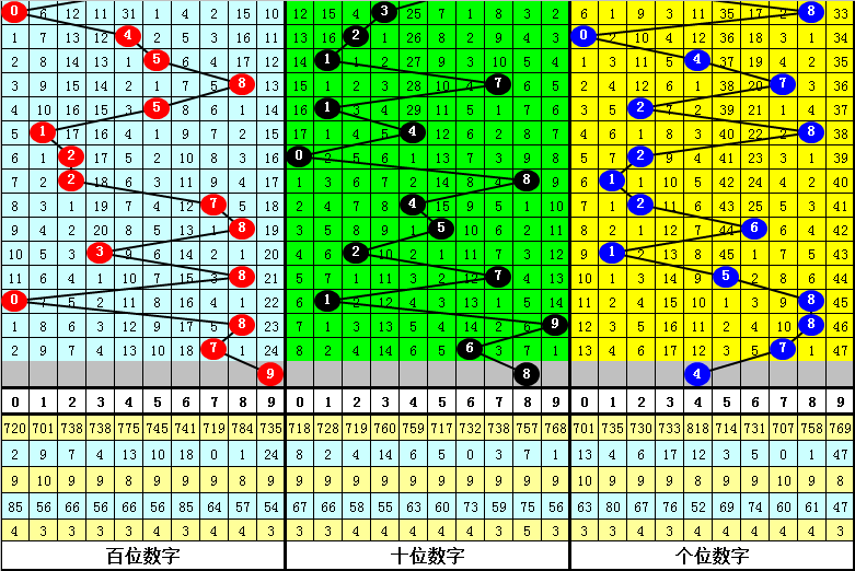 百位走势:近10期在0-8之间出号,跨度为9点,出号比较分散,上期奖号为7,下降1点,本期看好该位上升。另外近10期该位大小比为5:5,平衡,本期预计出现大号,关注号码9。