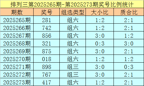 上期回顾:排列三第2025273奖号开出417,奖号质合比为2:1,大小比为1:2,跨度为6,类型为组六。