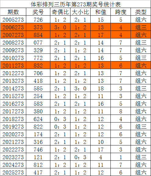 在历年排列三第274期开奖中:号码大小比为35:25,大号表现较热,本期看好大号再次热出,大小比关注2:1。