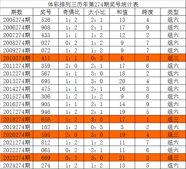 体彩排列三历年第274期开出奖号分别为:526、908、435、027、072、411、359、567、695、475、306、905、946、656、102、595、812、065、669、274。统计详见下表: