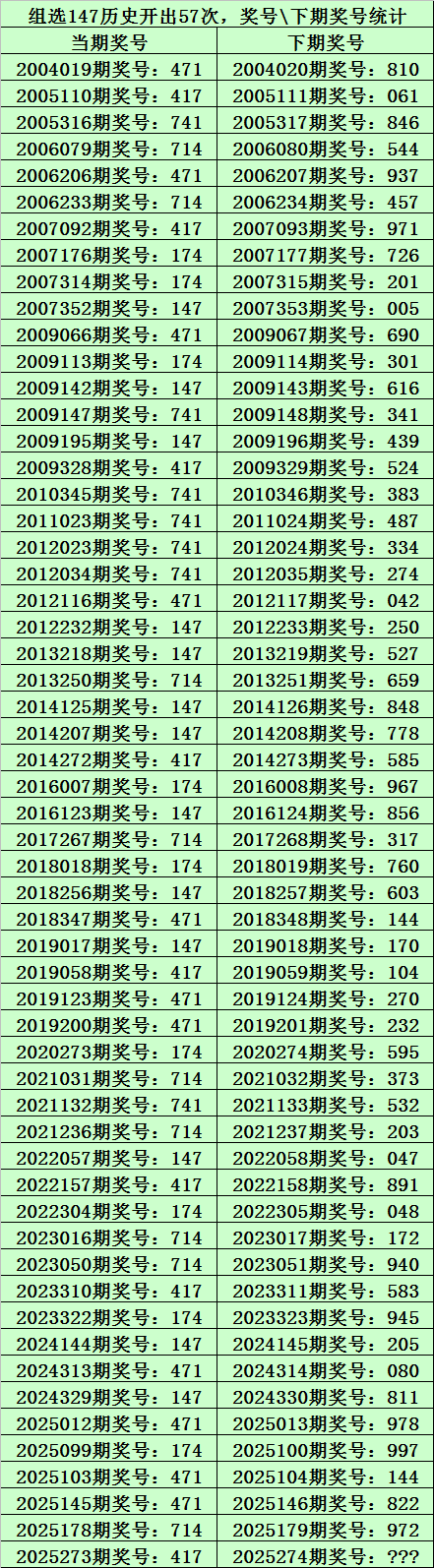 上期回顾:排列三第2025273期奖号为:417,类型:组六,历史上直选号码417出现了8次,组选号码147出现了57次。