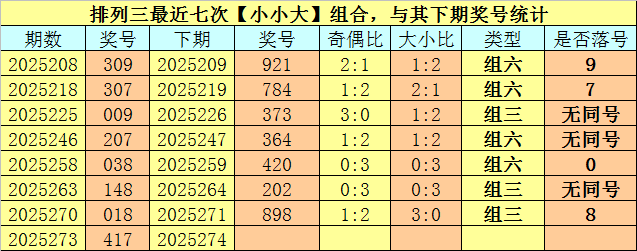 大小分析:排列三上期开出号码417,大小类型为【小小大】,最近七次开出大小类型小小大的奖号分别为:309、307、009、207、038、148、018,其下期分别开出号码:921、784、373、364、420、202、898。其中号码大小比为8:13,大号开出比例较低,本期适当关注大号回补,预计开出2个大号。