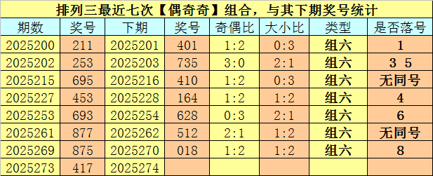 开奖回顾:排列三第2025273期开奖号码为:417。奖号类型为:组六,大小类型为:小小大,奇偶类型为:偶奇奇,包含重号:7。