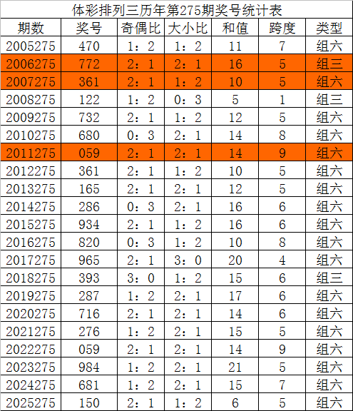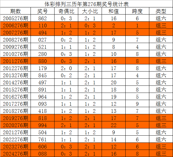 在历年排列三第276期开奖中:组三号码出现7次,组六号码出现13次。组三、组六号码出现比例持平,本期奖号形态关注:组六号码。