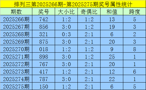 上期回顾:排列三第2025275期出现奖号150。开出组六,奇偶比2:1,012路比1:1:1,大小比1:2,和值6,跨度5。