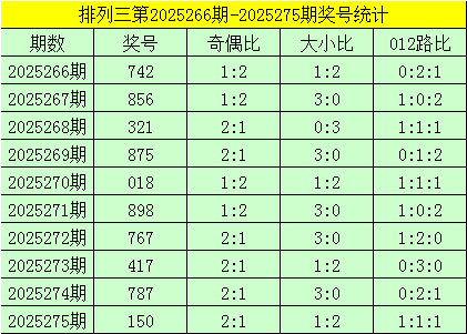 开奖回顾:排列三第2025275期奖号为:150,其奇偶比为2:1,大小比为1:2,奖号012路比为1:1:1。