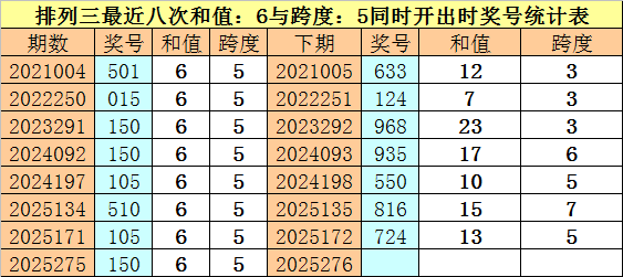 开奖回顾:体彩排列三第2025275期奖号为:150。和值为:6,跨度为:5。