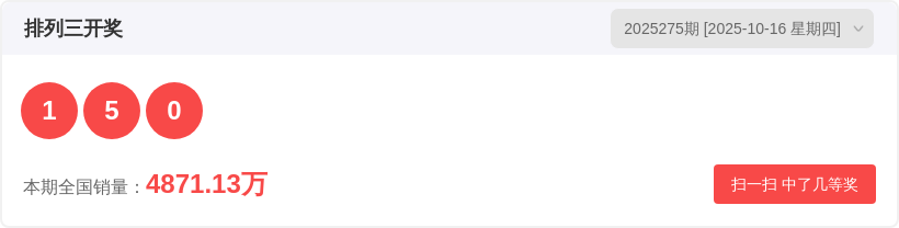 排列325275期开奖结果1 5 0,012路比1:1:1,和值尾6,和值6,跨度5。