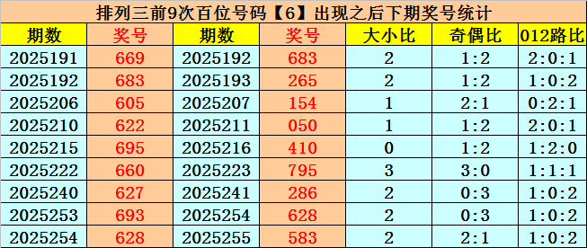 在百位前9次出现号码6之后,下期百位分别开出奖号:6-2-1-0-4-7-2-6-5,其中开出号码个数012路比是3:3:3,奇偶比是3:6,大小比是4:5。
