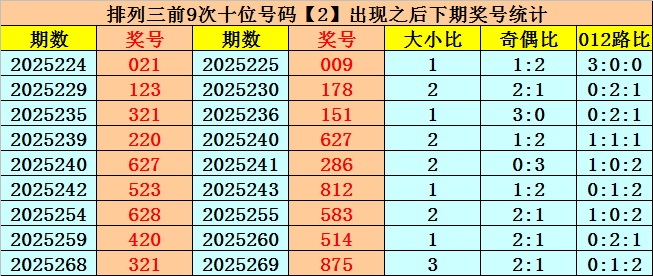 十位号码:十位上期开出奇数、大号、2路号码:2,历史上十位号码2共开出720期,上一次出现在第2025268期,上期奖号遗漏值为9期。