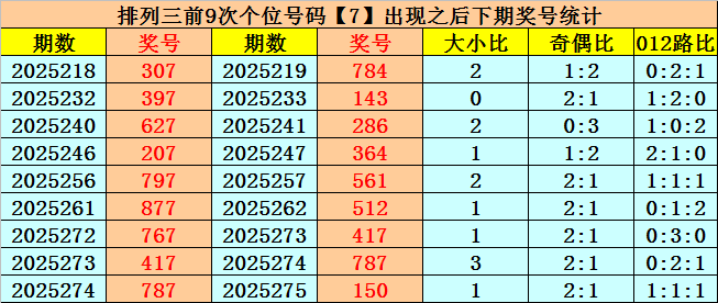 个位号码:上期奖号为大号、奇数、1路号码:7,历史上个位号码7共开出710期,前一次出现在第2025274期,上期遗漏3期再出。