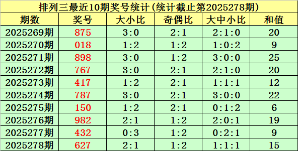 上期回顾:排列三第2025278期奖号为:627。奖号类型:组六,和值:15,奇偶比:1:2,跨度:5,大小比:2:1。