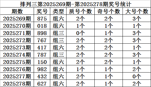 上期回顾:排列三第2025278期开奖:627,质合比为2:1,奇偶比为2:1,大小比为1:2。