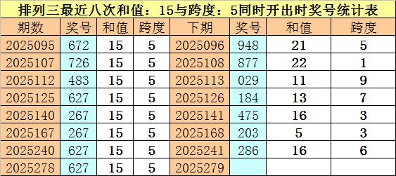 开奖回顾:体彩排列三第2025278期奖号为:627。和值为:15,跨度为:5。