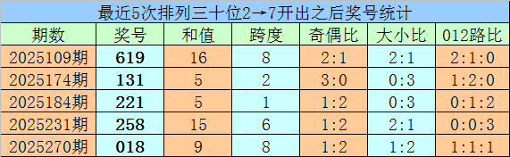 1、最近两期排列三十位号码开出号码分别为2和7,历史上十位号码连续两期同时出现号码2和7的奖号共开出72期。最近五次下期开出号码为:619、131、221、258、018;