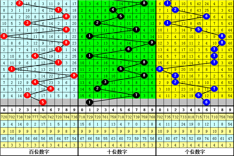 3、在以上0-9号码频次中,号码012路比为38:26:15,奇偶比为35:44,本期预计百位开出奇数号码,参考号码5。