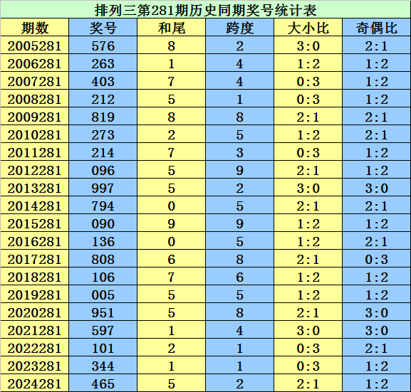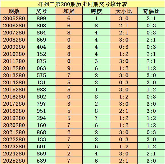 从2004年至今排列三已开出7404期奖号了,本期为排列三2025年第281期开奖,历史同期已出现20次奖号: