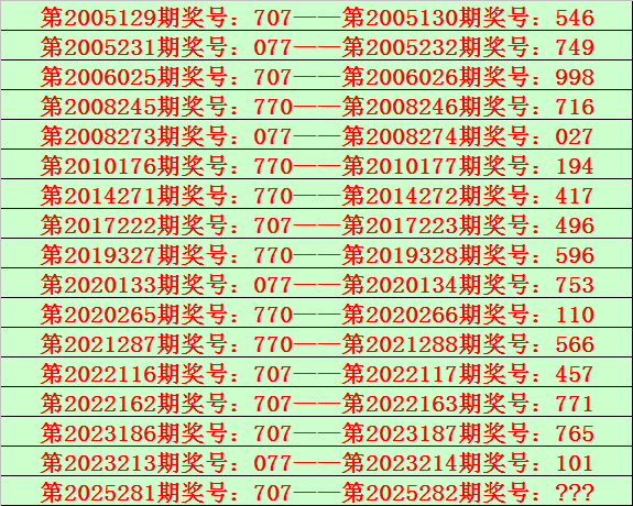排列三第2025281期开出奖号707,该号码历史上组选出现17次,前16次开出之后期下期奖号为:546、749、998、716、027、194、417、496、596、753、110、566、457、771、765、101,详见下表: