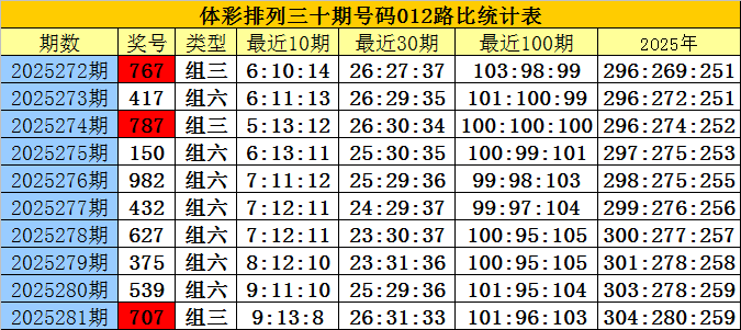 开奖回顾:排列三第2025281期奖号为:707,号码012路比为1:2:0。