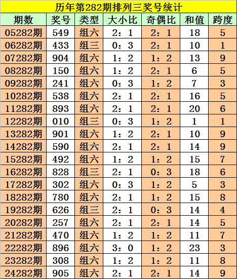 历年第282期排列三奖号:549 - 433 - 904 - 150 - 241 - 538 - 893 - 010 - 901 - 590 - 492 - 828 - 302 - 780 - 626 - 257 - 470 - 896 - 308 - 905。
