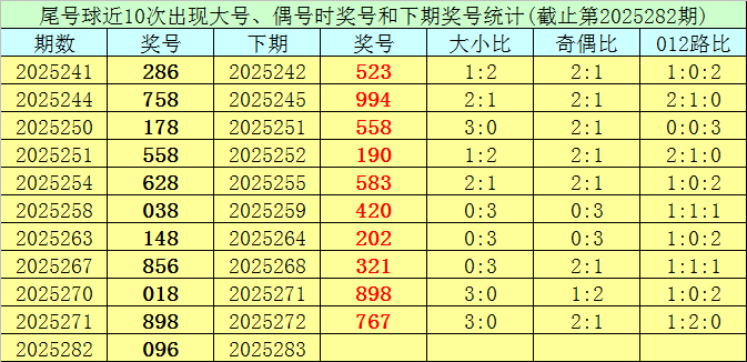 在尾号球前10次开出大号、偶号类型之后,其下期分别开出奖号:523、994、558、190、583、420、202、321、898、767,其中号码012路比为4:3:3,奇偶比为4:6,大小比为3:7。