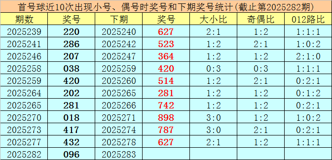 在首号球前10次开出小 号、偶号类型之后,其下期分别开出奖号:627、523、364、420、514、281、742、898、787、627,其中号码012路比为3:3:4,奇偶比为5:5,大小比为7:3。