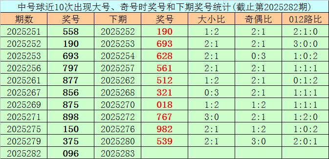 在中号球前10次开出大号、奇号类型之后,其下期分别开出奖号:190、693、628、561、512、321、018、767、982、539,其中号码大小比为5:5,012路比为5:2:3,奇偶比为5:5。