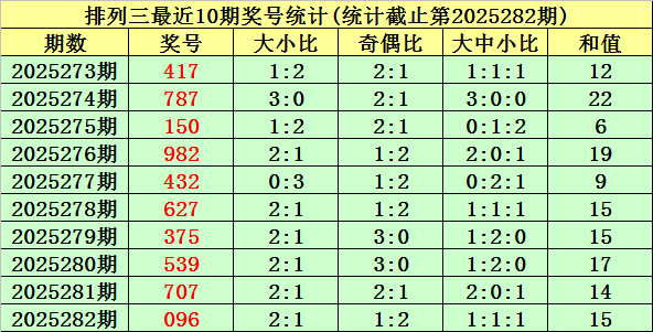 上期回顾:排列三第2025282期奖号为:096。奖号类型:组六,和值:15,奇偶比:1:2,跨度:9,大小比:2:1。