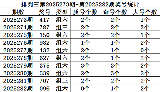 上期回顾:排列三第2025282期开奖:096,质合比为0:3,奇偶比为2:1,大小比为1:2。