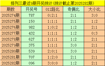 二、体彩排列三前9期奖号开出:787-150-982-432-627-375-539-707-096,其中奖号大小比为16:11,012路比为11:8:8,奇偶比为16:11;