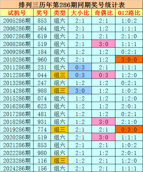 组选类型推荐:历史上排列三第286期同期奖号中,组六出现16期,组三出现4次,今年第286期预计奖号为组六号码。
