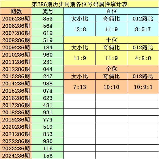 开奖回顾:排列三第2025285期开出奖号905,奖号012路比为2:0:1,大小比为2:1,奇偶比为2:1,最近三年第286期同期开出奖号为:第2022286期:980、第2023286期:116、第2024286期:156。