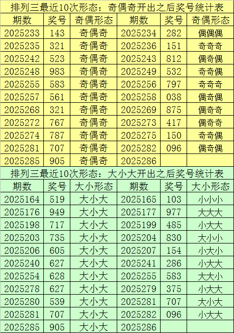 排列三最近10次同时开出奇偶形态:奇偶奇和大小形态:大小大时其奖号分别为:727-549-549-905-945-907-527-747-949-707-905,下期分别开出号码为:734-835-008-285-810-220-627-894-977-096,详细统计见下表: