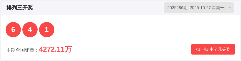 排列325286期开奖结果6 4 1,质合比1:2,大小比1:2,和值11,跨度5。