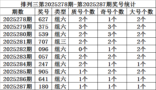 上期回顾:排列三第2025287期开奖:180,质合比为1:2,奇偶比为1:2,大小比为1:2。
